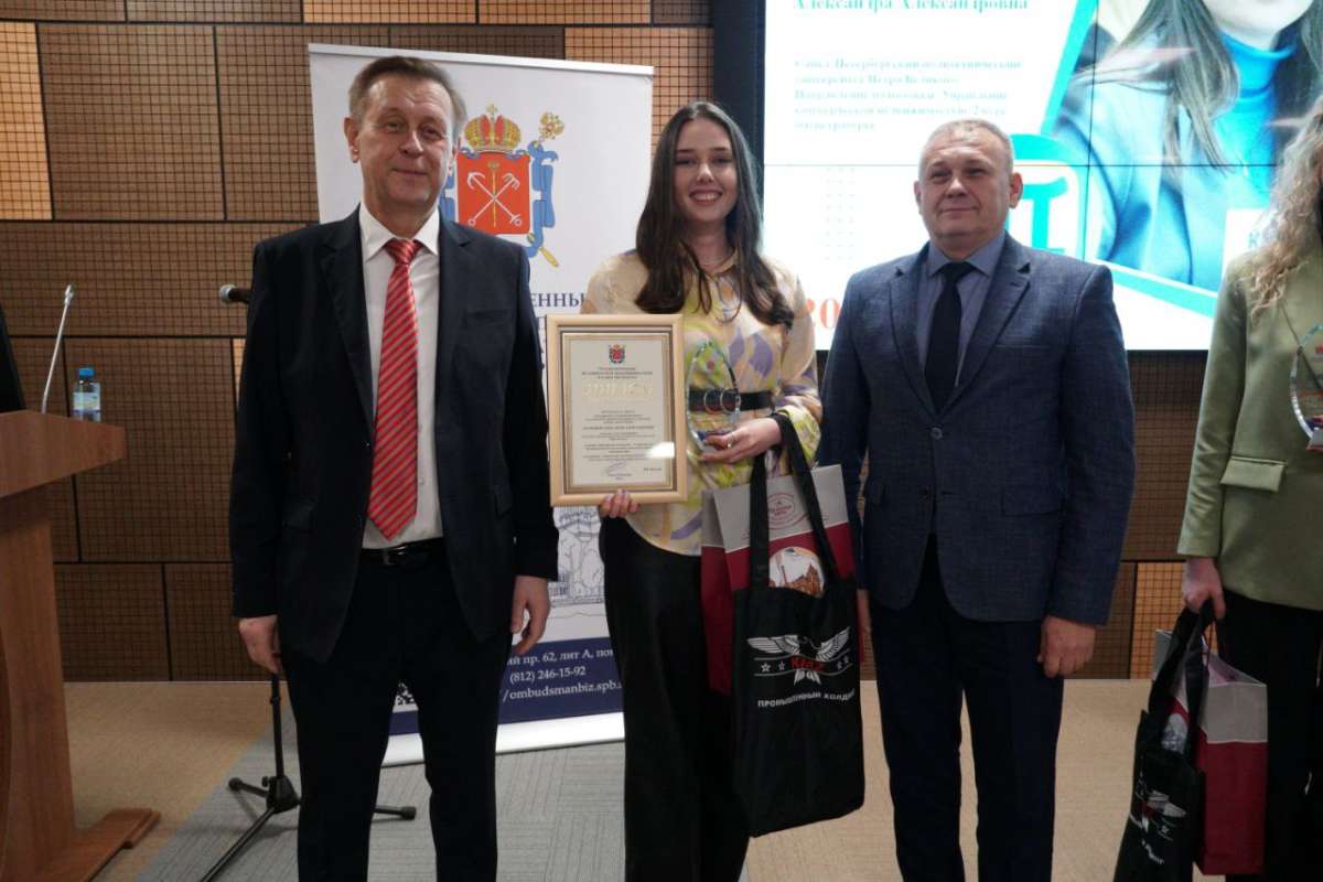 15 декабря в «Невской Ратуше» состоялась торжественная церемония награждения победителей ежегодного конкурса студенческих работ «БИЗНЕС ИМЕЕТ ПРАВО», проводимого уполномоченным по защите прав предпринимателей в Санкт-Петербурге. Диплом победителя в одной из ключевых номинаций получила студентка магистратуры направления «Сервис» программы «Управление коммерческой недвижимостью» Высшей школы сервиса и торговли Александра Лазарева.